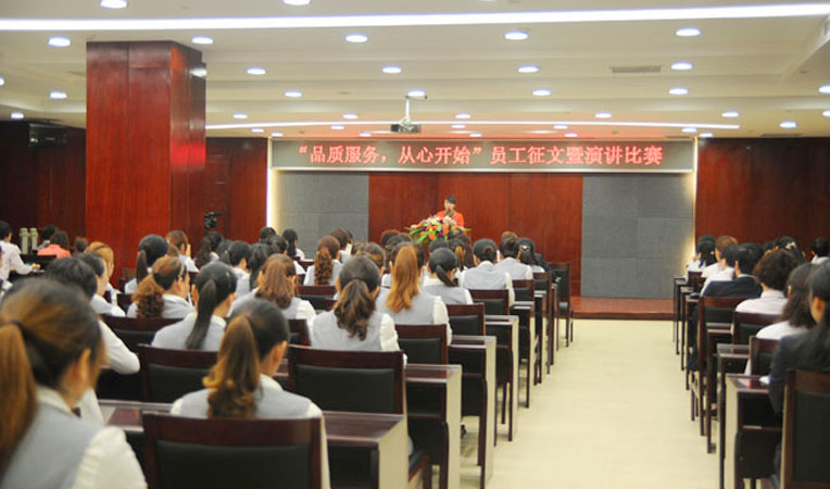 2012年10月18日上午,“微笑服務、溫馨窗口” 系列活動之三——“品質服務,從心開始”員工征文暨演講比賽在華億國際7樓報告廳舉行。華億集團副董事長、華億國際副總經理章國琴,華億集團副總裁張靖,偉晨文化總經理兼華億國際副總經理孫艷,華億國際藝術總監潘金華等擔任此次比賽評委。華億國際經營班子成員和員工代表近200人參加了活動。