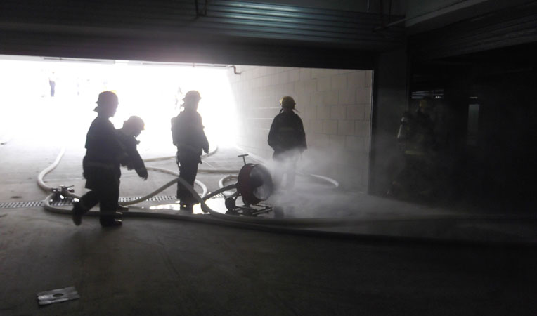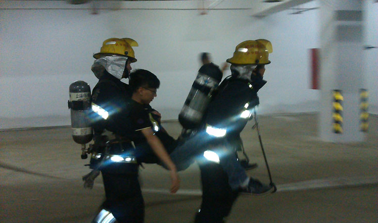 根據(jù)演練前布置,南陵消防大隊到達現(xiàn)場后,迅速展開偵查、警戒工作。在了解現(xiàn)場情況后,消防隊員兵分兩隊,一路直奔地下車庫救人,一路奔向高層住宅滅火。10分鐘后,火情被控制,并成功從地下室營救出1名被困人員。