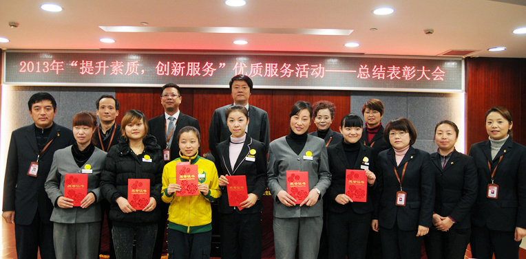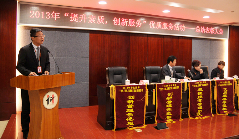 12月26日上午,華億國際2013年“提升素質,創新服務”優質服務活動總結表彰大會在華億國際報告廳舉行。華億國際總經理項領、副總經理章國琴,常務副總經理張樹華,副總經理孫艷、陳朝暉、柯琳、王萍、張玲、錢冬林出席了會議,并為獲獎個人和集體頒獎。