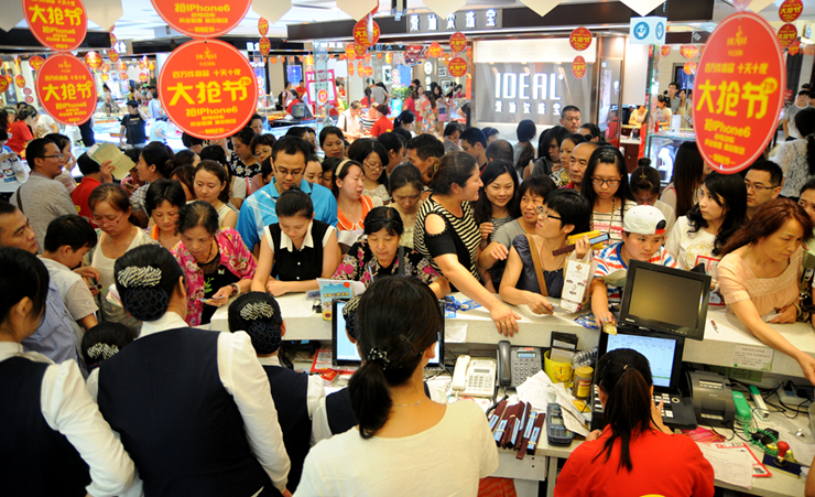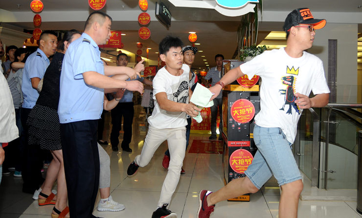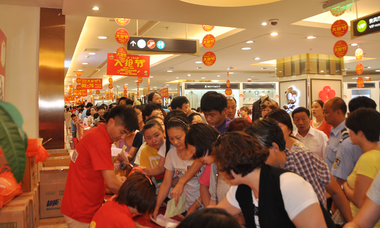 “大搶節(jié)”活動(dòng)第一天晚上的一幕也許更能說(shuō)明問(wèn)題:商場(chǎng)開展了搶蘋果手機(jī)和電動(dòng)車的活動(dòng),許多消費(fèi)者提前數(shù)小時(shí)就在排隊(duì)等候,相互交流著“搶”的技巧,臨近晚上11點(diǎn),不少排隊(duì)的消費(fèi)者開始興奮地倒數(shù)計(jì)時(shí),“還有一分鐘……30秒……11點(diǎn)啦!”當(dāng)?shù)谝粋€(gè)消費(fèi)者以百米沖刺的速度飛奔過(guò)去,現(xiàn)場(chǎng)開始沸騰了,短短10分鐘,10部手機(jī)和75輛電動(dòng)車就被“搶”空了。一位女士“搶”到,激動(dòng)地大喊大叫,興奮異常。