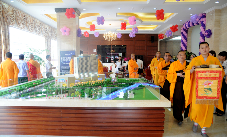 當(dāng)天上午9時(shí)9分,在繁昌華億廣場營銷中心前,九華山大悲樓的法師們開始了開光祈福典禮儀式。慧深法師的大弟子果龍師傅及眾多弟子誦經(jīng)鳴鐘,繞場灑甘露,為華億廣場開光祈福,并祈愿每一位客戶和到場賓朋幸福安康。現(xiàn)場嘉賓莫不肅靜虔誠,雙手合十,與大師一道祈福。在祈福大典中,大師還對商鋪門牌進(jìn)行了開光,寓意福照家門、福運(yùn)綿長;并現(xiàn)場向客戶贈(zèng)送了已開光的佛珠手串,寄語好運(yùn)。