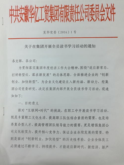 4月11日,華億集團黨委、團委根據集團2016年度經濟工作大會精神,圍繞“適應新常態、打好轉型仗、謀求新發展”的總體思路,聯合下發了關于在集團內部開展讀書學習活動的通知。旨在通過開展為期90天讀書學習活動,為全公司形成常態化學習風氣打下基礎。通過不斷提升員工的學習力,為企業文化建設注入新內涵、新動力,從而加快加實推進企業的“創新創業,加快轉型”。
