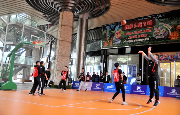 17日上午,本屆3V3籃球賽在華億國際AB座連廊天橋下舉行,華億國際副總經理楊艷菁女士、華億國際大客戶部經理張曉華、華億國際運動商場經理柳靜出席開幕式。楊艷菁副總經理代表大賽主辦單位致辭并宣布大賽開幕。