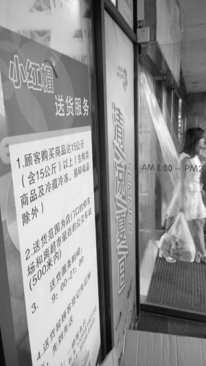 華潤萬家華東地區的門店也新推了“小紅帽送貨服務”:顧客購買15公斤以上商品(易碎品、生鮮、冷藏冷凍商品除外),可以送到500米以內的公交車站或者停車場。“附近的顧客也可以直接打電話到我們門店服務臺告知要購買的商品,超過150元后我們也可以免費送貨上門。”華潤萬家施家橋店店長透露。