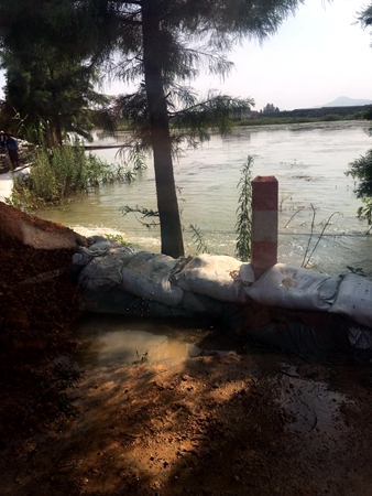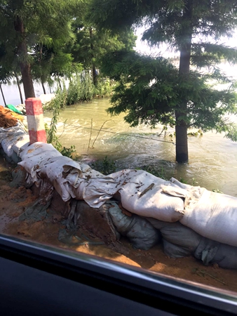 在去平鋪鎮(zhèn)的路途中,我們經(jīng)歷了小小的波折,剛過(guò)漳河大橋不遠(yuǎn)處,地勢(shì)低洼,路面積水約1米左右,救援車(chē)隊(duì)無(wú)法通行。無(wú)奈之下,我們選擇了鄉(xiāng)村小路繞過(guò)積水路段,原本狹窄的圩堤道路隨處可見(jiàn)圍堵洪水的沙袋和黃土堆,使得車(chē)輛通行變得十分困難,農(nóng)田和圩區(qū)成了一望無(wú)際的“海洋”,讓我們切身體會(huì)到災(zāi)情的嚴(yán)重,以及救災(zāi)的困難程度。