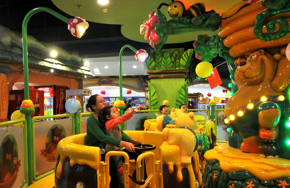 小熊吃蜂蜜 是一款親子互動類的游樂項目,游客乘坐在蜜罐中,中心六個花朵按一定頻率隨機噴出蜂蜜球,游客通過方向盤的控制蜜罐旋轉,接住花朵吐出的蜂蜜球,并由車內計分器記錄得分。整個游戲過程輕松動感、互動體驗性強、隨著燈光節奏和音樂,可鍛煉小朋友的視覺觸覺與動作協調能力。