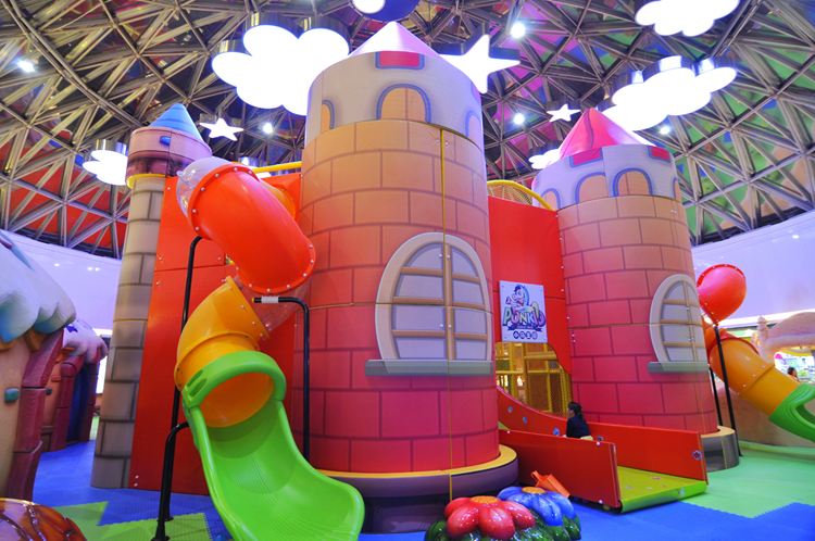 彩虹城堡占地200余平米,共計四層,最高處達到11米,頂部玻璃營造一幅天幕,配合以日月星辰造型、聲光電效果,可以感受到奇妙的天氣變化。城堡內部,蹦床、獨木橋、攀爬、高空滑降……精彩刺激不斷。同時保護設施全面到位,家長可以放心地讓孩子在這里盡享歡樂時光。
