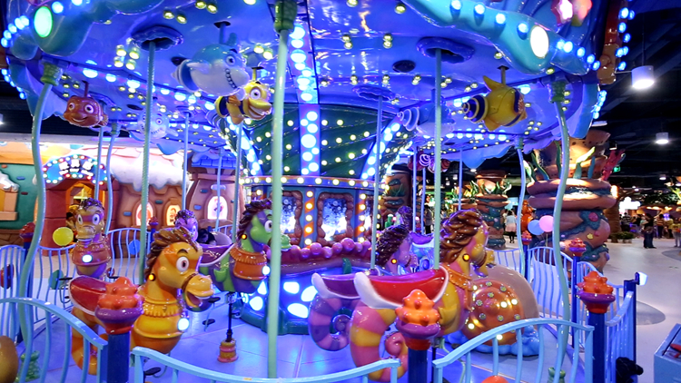 海底總動員是一款旋轉木馬類游樂項目,小朋友可以乘上可愛的海馬跟隨海洋里的小動物一起享受快樂的海洋之旅,海螺車采用親子雙座設計,家長可以陪同孩子一起在海洋中遨游。在乘坐海馬的同時還可以操縱小魚的尾部使之旋轉,更具互動性。
